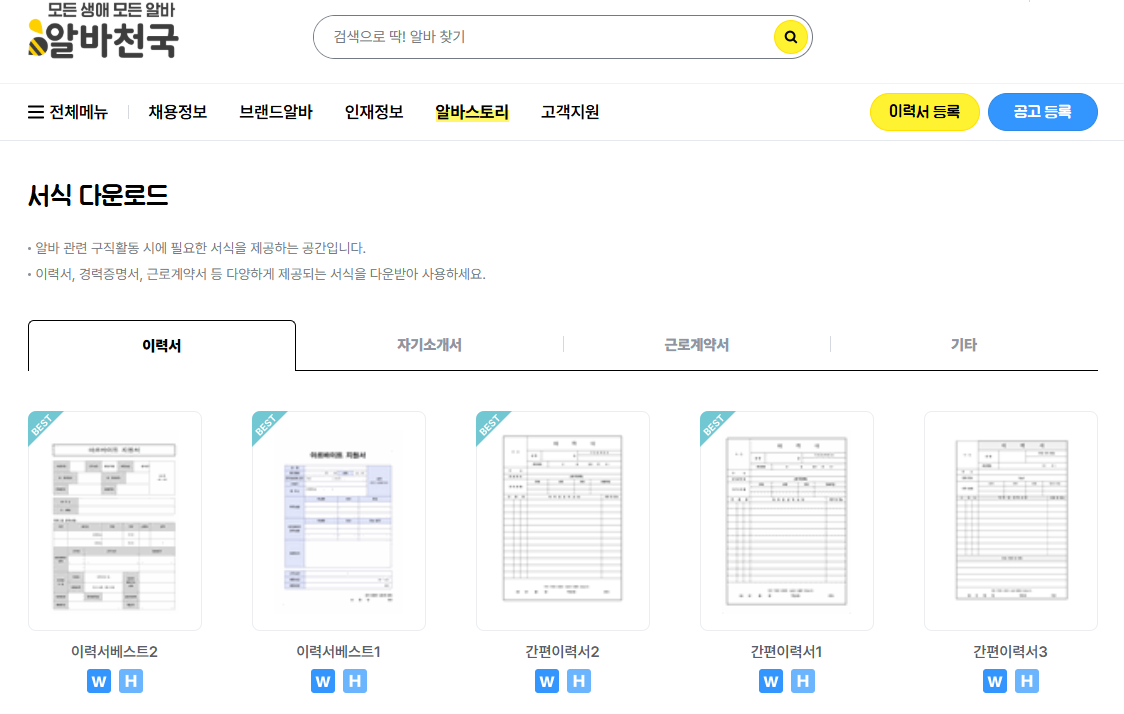 | 잡코리아 | DOC / HWP | 신입/경력 별 이력서 다양 |