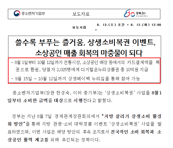 ‘상생 소비복권’은 중소벤처기업부가 주관하고, 전국의 전통시장 및 소상공인 매장에서의 소비를 촉진하기 위한 정부 이벤트입니다.