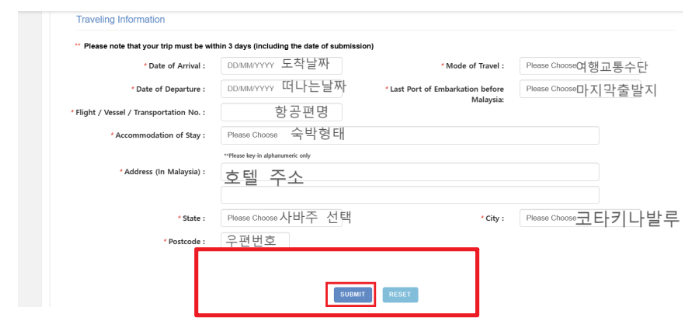 이와 같은 정확한 입력이 되어야 말레이시아 입국신고서가 정상적으로 처리됩니다.