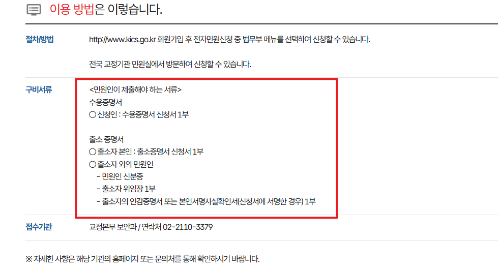 - 관할 교정기관 또는 법무부 웹사이트 접속
