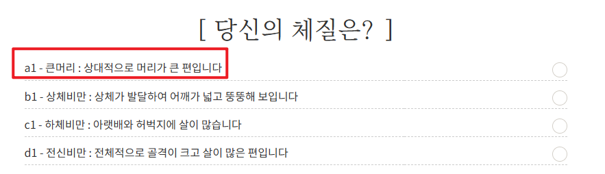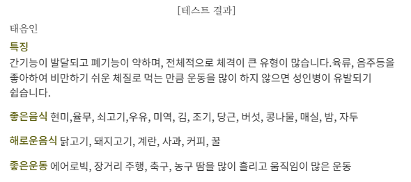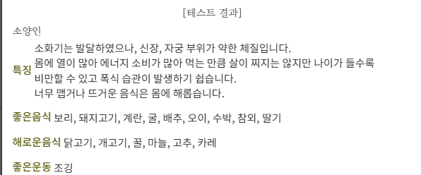 이 테스트는 온라인에서 간단하게 할 수 있으며, 결과를 통해 본인의 체질 유형을 확인할 수 있습니다.