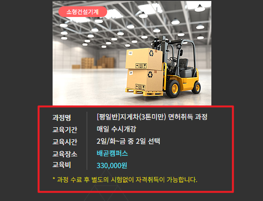 다만 3톤 미만은 소형 지게차로 분류되어 일부 교육기관에서는 단기간 교육 이수만으로 취득 가능한 과정도 운영하고 있습니다. 보통 이론 6시간, 실습 6시간의 교육을 이수하면 됩니다.