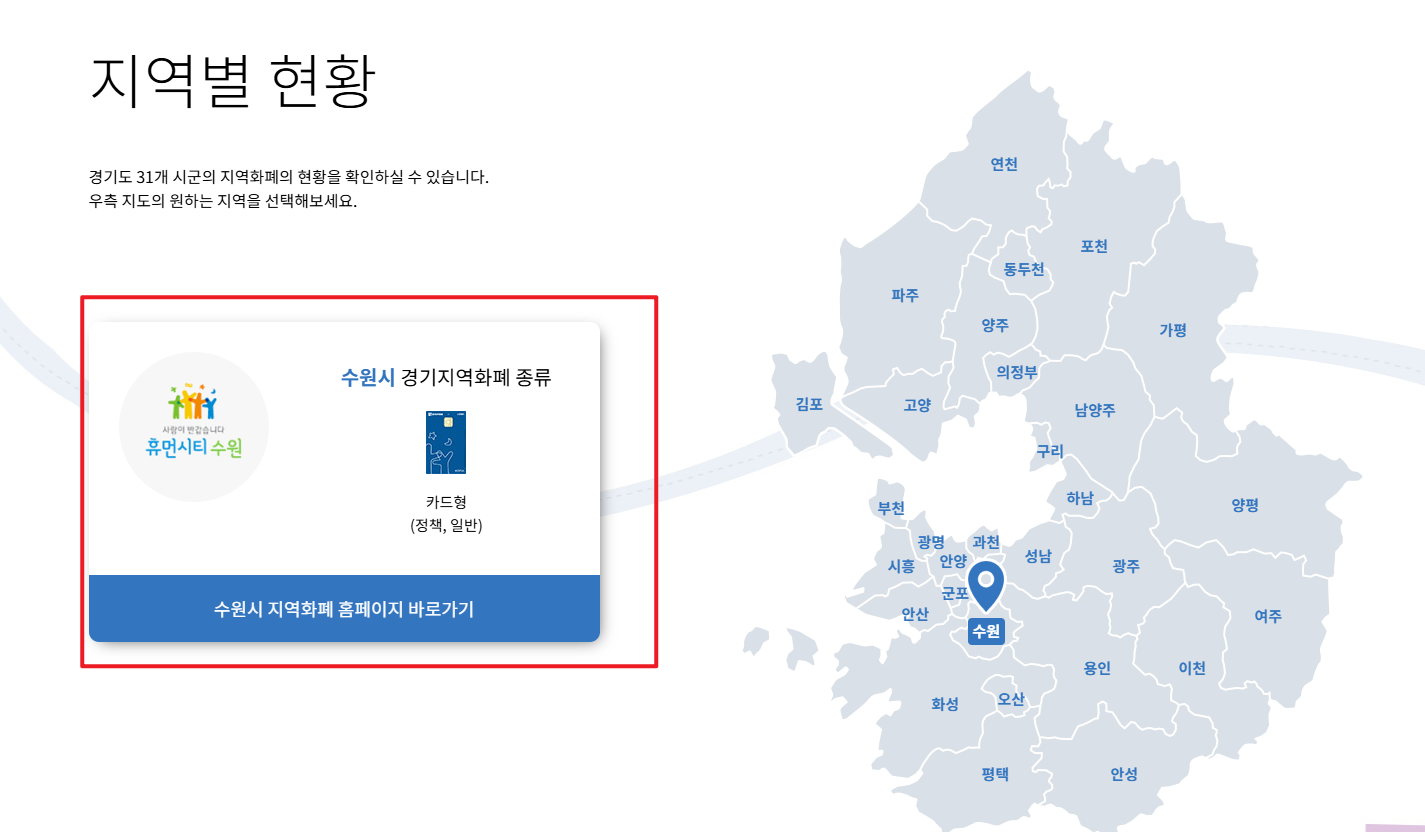 수원시 소상공인들의 매출증대에 기여하고 지역경제 선순환을 유도하기 위해 수원시에서 발행하는 카드형 지역화폐 발행일자 : 2019. 4. 1. 신청자격 : 본인명의의 은행계좌를 가지고 있는 만14세